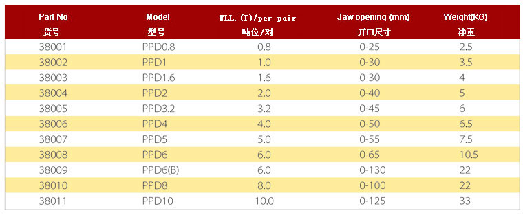 .額定載荷是指吊鉗成對(duì)使用、吊點(diǎn)夾具為60度時(shí)允許起吊的最大重量,吊裝作業(yè)中兩只或4只配套成組使用
